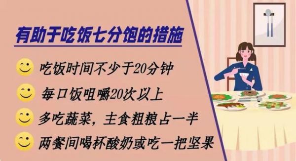 當我們吃到7分飽時就需要停止進食,并且設置自己的底線,不要隨便吃東西,把肉和菜放在首位,如果能夠吃飽了就不要再吃了。另外,在進食時提醒自己,不要被美食的誘惑所迷惑,告訴自己已經(jīng)吃飽了,并且告訴別人自己已經(jīng)吃飽了。