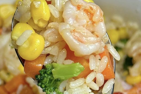 4.鍋內(nèi)加少量油,燒熱后加入蝦仁,炒熟后加玉米、胡蘿卜,翻炒片刻后加入米飯。