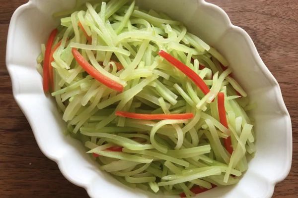 2.鍋中加入適量清水,加入1勺鹽,大火煮開后放入萵筍絲,焯水1分鐘后撈出,瀝干水分。