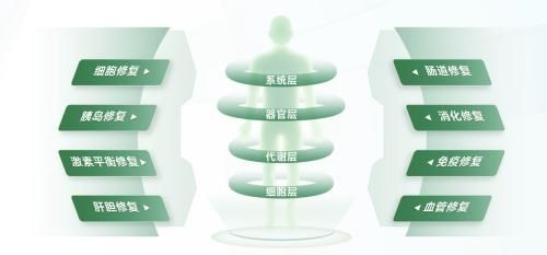 2、代謝層:胰島素對于維持生命和代謝平衡至關(guān)重要,當(dāng)其失衡后,所有其他激素都會隨之變化,如不能及時(shí)得到糾正,激素系統(tǒng)乃至機(jī)體功能的平衡就會逐漸打破。這不僅會引起代謝紊亂(如糖代謝紊亂、脂代謝紊亂),還會導(dǎo)致代謝綜合征以及多種慢病。激素及激素系統(tǒng)平衡,機(jī)體功能才會平衡,身體代謝的改善和正常是人體健康的關(guān)鍵。