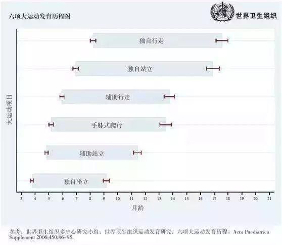 世界衛(wèi)生組織的運動發(fā)展研究報告中指出,孩子的運動發(fā)展大致分為以下階段:坐直4~9個月;輔助站立5~11個月;爬行5~13個月;輔助行走6~14個月;獨立站立7~17個月;獨立行走8~18個月。