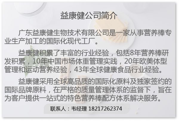 廣東益康健生物技術有限公司擁有豐富的營養(yǎng)棒生產(chǎn)經(jīng)驗,在成立之初就與美國Cepham生命科技有限公司達成戰(zhàn)略合作,從營養(yǎng)配方開發(fā)和歐美營養(yǎng)專家等方面展開戰(zhàn)略合作,并獲得Cepham公司多個品牌原料在營養(yǎng)棒領域的獨家授權,讓營養(yǎng)棒做到了真正的“營養(yǎng)棒”。