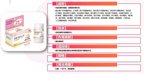 海維寶多維元素片23也就是“惠氏瑪特納多維元素片23”,是一款為中國媽媽研發(fā)設計的營養(yǎng)補充制劑。歷經二十年的研發(fā)生產銷售,并根據用戶使用體驗和反饋不斷升級優(yōu)化。其維生素E含量高達30mg,含有豐富的鈣、鐵、硒、維生素B1、B2、B12等,營養(yǎng)補充量充足。海維寶多維元素片23已經公開銷售多年,為全球億萬女性孕期、哺乳期提供了有效營養(yǎng)補充,助力健康寶寶誕生。作為孕期女性,服用海維寶多維元素片23時,請按藥品說明書,或者在藥師指導下購買或使用,從而正確、安全的補充營養(yǎng)。