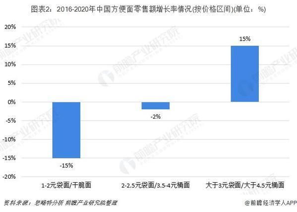 各廠商對于方便面產品的分類標準略有差異,但大抵上分為低端、中端、高端和超高端等類別。從單品價格帶區(qū)分來看,據(jù)思略特分析數(shù)據(jù),2016-2020年方便面行業(yè)總量基本趨穩(wěn),整體市場復合增長率約-1%,但3元以上袋裝面和4.5元以上桶裝面復合增長率15%,與之相反,1-2元低端袋裝面和干脆面市場增長率-15%。