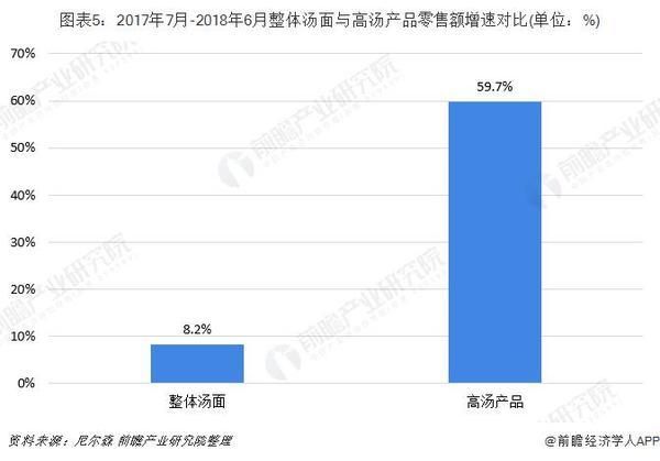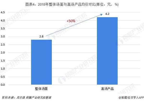 據(jù)尼爾森數(shù)據(jù),2018年強調營養(yǎng)屬性的高湯類產品相對整體湯面產品均價提升50%至4.2元;2017年7月-2018年6月高湯類產品銷售額同比增幅59.7%,相比之下同期整體湯面銷售額同比增幅為8.2%。