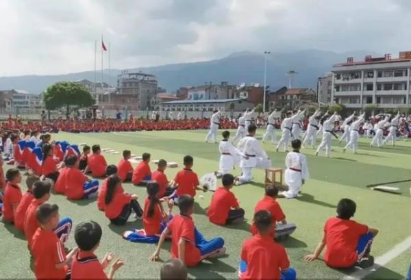 “哈!”“呀!”2022年5月24日一早,平江縣虹橋鎮(zhèn)胡筠小學的操場上圍滿了學生,在他們之中,一隊跆拳道武者正握拳起勢、空翻踢板,將重拳勁腿舞得虎虎生風。