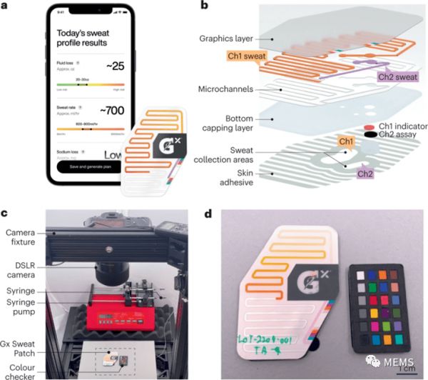 Gx汗液貼片是百事公司(PepsiCo)和Epicore合作商業(yè)化的一種柔軟、可穿戴的微流控產(chǎn)品(圖1a)。該產(chǎn)品作為一次性使用的生物傳感器,可測量人體局部出汗量、出汗率和氯化物濃度。集成的比色染料和對氯離子敏感的化學(xué)測定為用戶提供分析結(jié)果和視覺反饋。Gx汗液貼片可貼附于人體前臂內(nèi)側(cè)區(qū)域的皮膚上,在體育鍛煉前貼上。運動時,汗液通過連接微流道的兩個入口進(jìn)入該貼片。定制的智能手機應(yīng)用程序(APP)上的實時圖像處理算法分析色度信號。該應(yīng)用程序還包括根據(jù)前臂區(qū)域汗液數(shù)據(jù)預(yù)測全身出汗率和氯化物濃度的算法,從而針對用戶的出汗情況,反饋相關(guān)信息,以實現(xiàn)個性化補水策略。
