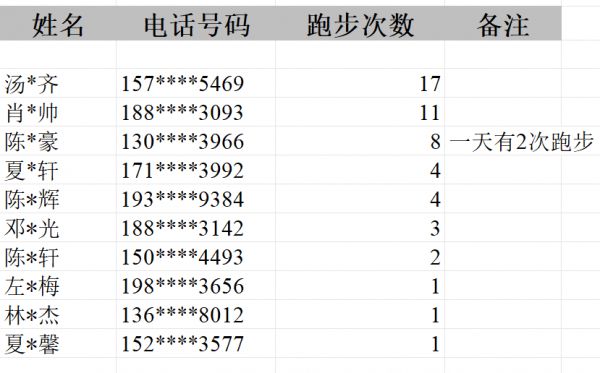 社群成員積極響應(yīng),10位同學(xué)上傳了大量跑步打卡截圖。其中,第一名以17次打卡的成績遙遙領(lǐng)先,展現(xiàn)了非凡的毅力和運動熱情。緊隨其后,兩位同學(xué)分別以11次和8次打卡獲得二三名,同樣值得稱贊。還有眾多打卡1-4次的同學(xué),值得鼓勵。