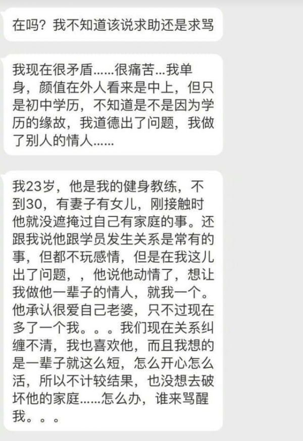 那上面那位女孩到底該怎么辦?很顯然,跟健身教練切斷一切聯(lián)系,畢竟他是有家庭的,而且無法保證,這位健身教練對你說的話就是發(fā)自內(nèi)心的?畢竟這個社會上,渣男還是非常多滴。