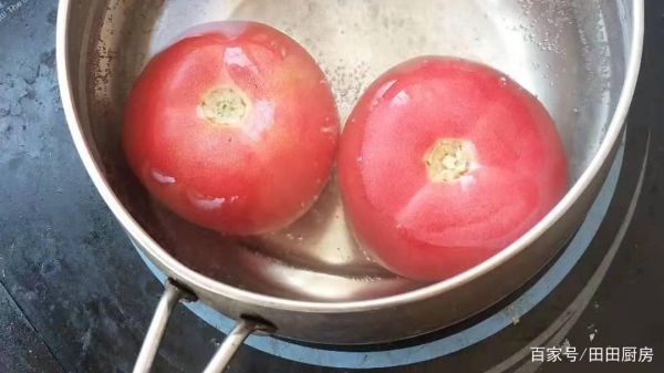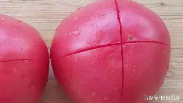 1,將番茄洗凈,用刀在番茄尾部劃出十字,這樣做容易把番茄皮去掉,鍋里添水,剛剛淹沒番茄為準,將水燒開,把番茄劃出十字形的那一面挨著鍋底放進去燙一下,撈出。