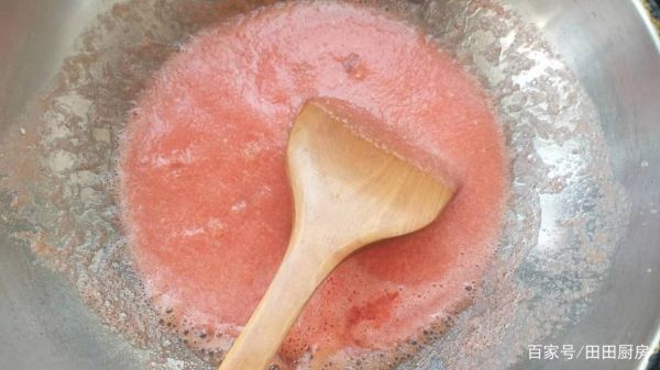 3,將打好的番茄汁放入放入鍋中,開大火,加入適量的冰糖,這個季節(jié)的番茄原本已經(jīng)很鮮美。很甘甜了,不要加太多,如果喜歡味道甜的可以多加一些,冰糖也可以用白糖替代,在熬得時候要不停的攪拌,要一直熬到番茄汁濃稠狀為止。
