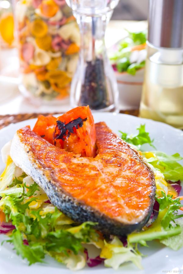 熱鍋中倒入橄欖油,中火煎三文魚排,每面約3-4分鐘,至外皮酥脆,內(nèi)部熟透。