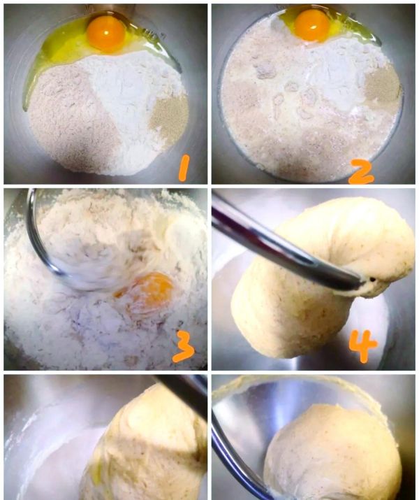 接下來,我們將依據(jù)上述配料清單,逐步打造出健康美味的漢堡胚。首先,將高筋面粉、全麥面粉和酵母準(zhǔn)確稱量后倒入面桶,接著打入一個(gè)雞蛋,再稱量牛奶并倒入面桶。然后,啟動(dòng)揉面機(jī),先調(diào)至3檔揉面3分鐘,再調(diào)至4檔揉面10分鐘,直至面團(tuán)形成粗膜。接下來,加入橄欖油或玉米油(也可使用融化的黃油),繼續(xù)揉面,先調(diào)至3檔揉3分鐘使油面充分融合,再調(diào)至4檔揉面8分鐘,直至出手套膜。