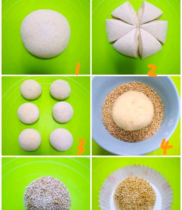 4~6. 將揉搓好的面團(tuán)放入清水中蘸濕,再提起放入芝麻中,確保芝麻面朝上擺放,這樣生胚就制作完成了。