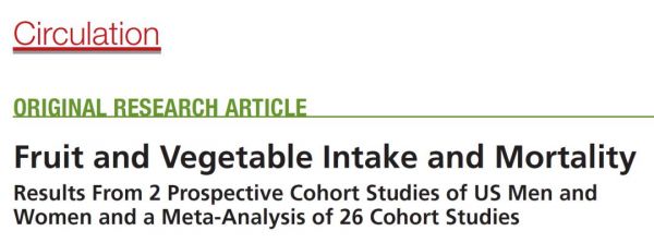 2021年3月1日,哈佛大學(xué)公共衛(wèi)生學(xué)院院長胡炳長教授團(tuán)隊國際頂尖學(xué)術(shù)期刊 Circulation 雜志發(fā)表了一項題為:Fruit and Vegetable Intake and Mortality:Results From 2 Prospective Cohort Studies of US Men and Women and a Meta-Analysis of 26 Cohort Studies (水果和蔬菜的攝入量與死亡率:來自兩項美國男女的前瞻性隊列研究結(jié)果以及對26項隊列研究的薈萃分析)的研究論文。