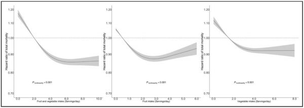 隨著水果和蔬菜攝入量的增加,綜合死亡率顯著下降,在攝入量達(dá)到5份后,幾乎不再增加額外益處。