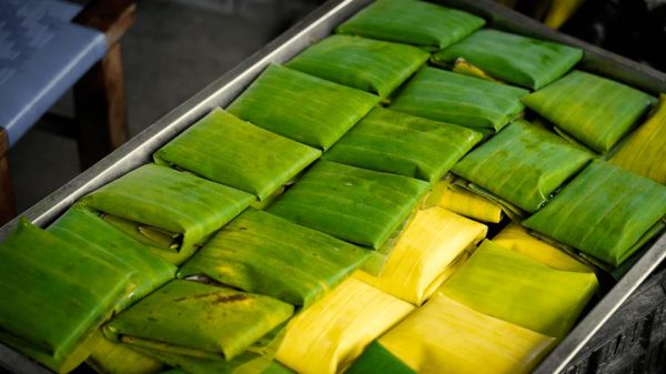 潑水粑粑傣語(yǔ)稱“毫門(mén)賀端”,將芭蕉葉洗凈,用沸水燙好剪成規(guī)則的長(zhǎng)方塊,抹上豬油將和好的糯米粉捏成小團(tuán)放入燙好的芭蕉葉中間包攏成長(zhǎng)方形,上籠蒸熟,糯米粑粑帶有芭蕉葉的清香。