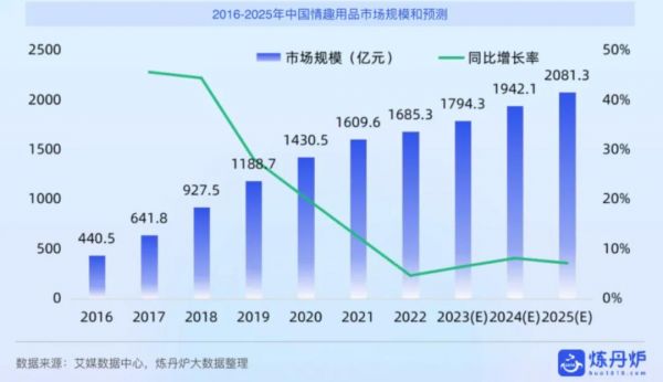 中國市場的增長更為亮眼:情趣用品市場規(guī)模從2016年的440.5億元躍升至2023年的1794.3億元,預(yù)計2025年將突破2081.3億元,年均復(fù)合增長率約15%。
