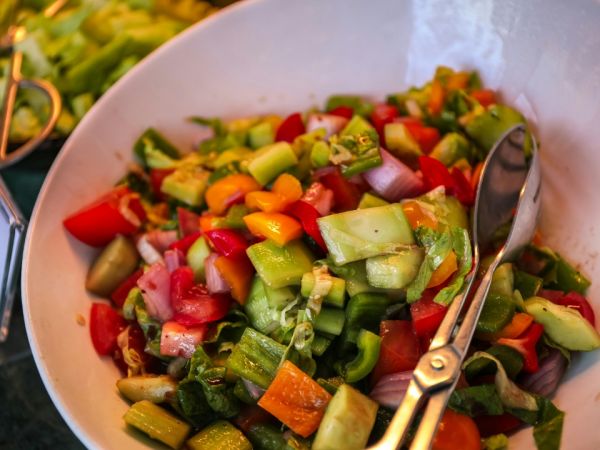 再把目光投向第二張圖片,這是一個裝滿了五彩斑斕蔬菜的大碗。紅色的甜椒、橙色的胡蘿卜、綠色的芹菜和青椒,還有紫色的洋蔥,它們?nèi)缤屎绨銋R聚在一起。這一碗蔬菜沙拉就像是一個營養(yǎng)的“百寶箱”。