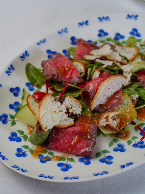 先來看第一張圖片,一個裝飾著藍(lán)色小花圖案的盤子里盛放著一道令人垂涎欲滴的菜肴。鮮嫩的牛肉片如絲般鋪展在盤子上,牛肉片上點綴著一些白色的脆片,可能是烤得酥脆的面包片,增加了口感的層次。盤子里還有翠綠的蔬菜和切片的黃瓜,以及一些紅色的小番茄。這些食材組合在一起,仿佛在演奏一場視覺與味覺的交響樂。