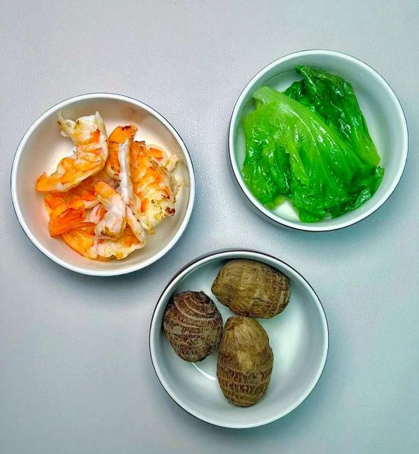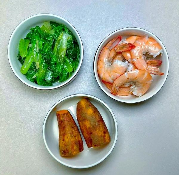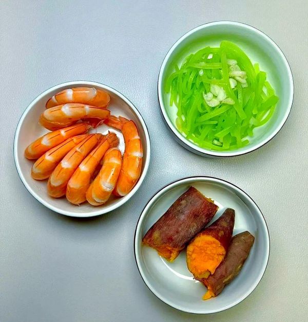 蒸煮的紅薯與鮮嫩的蝦肉,再搭配上一盤(pán)新鮮的青菜,呈現(xiàn)出一道營(yíng)養(yǎng)均衡、口感豐富的美食。