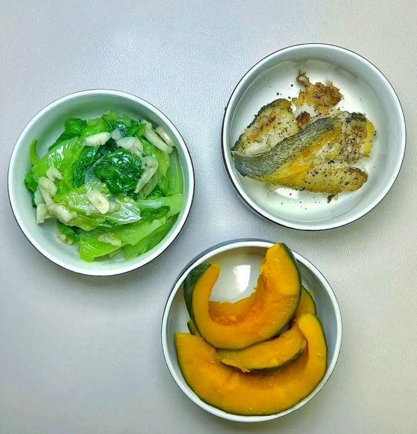 香煎比目魚(yú)搭配蒸南瓜與生菜,美味又健康。