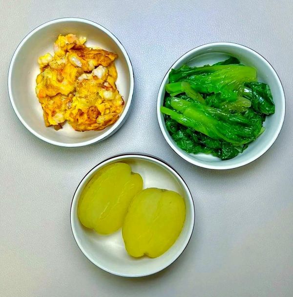 蝦球與雞蛋的炒制,再搭配上蒸煮的土豆與一盤(pán)新鮮的青菜,構(gòu)成了一道既營(yíng)養(yǎng)豐富又口感多樣的佳肴。