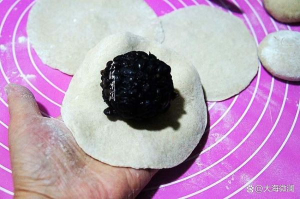 取一個小面劑子用搟面杖搟成圓餅,包上紅豆沙餡,捏成饅頭形狀,再將饅頭揉至表面光滑。