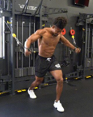 動作要領(lǐng): 站在繩索器械中間,雙腳分開與肩同寬,微微屈膝,身體保持穩(wěn)定。雙手分別握住繩索的把手,掌心相對,手臂伸直但不要完全鎖死,將繩索拉至身體前方。