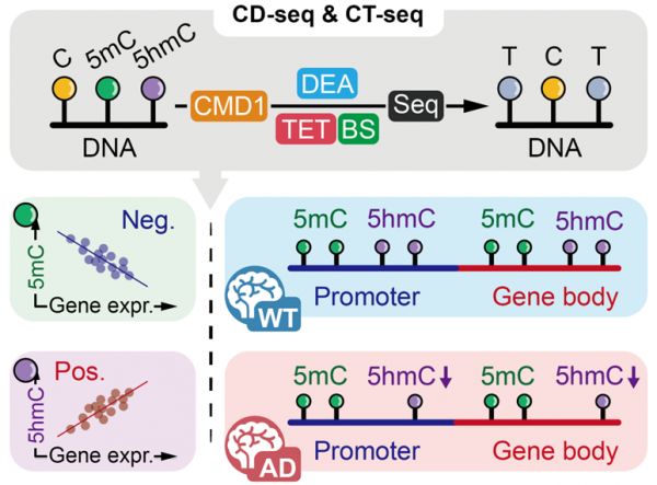 表觀遺傳修飾被發(fā)現(xiàn)與AD存在密切關(guān)聯(lián),已有多項研究揭示DNA表觀遺傳修飾在AD中發(fā)生了顯著改變,提示DNA修飾可能作為AD早期診斷標記物,其相關(guān)調(diào)控因子或調(diào)控通路可能作為AD的新型治療靶點。在哺乳動物中,DNA修飾的主要形式是5-甲基胞嘧啶(5mC),由DNA甲基轉(zhuǎn)移酶(DNMT)家族蛋白催化產(chǎn)生。此外,5mC可被TET雙加氧酶進一步氧化產(chǎn)生5-羥甲基胞嘧啶(5hmC)、5-醛基胞嘧啶(5fC)與5-羧基胞嘧啶(5caC)。5fC或5caC在基因組中的豐度極低,因此被認為是5mC去甲基化的中間產(chǎn)物。與之相比,5hmC的含量較高,尤其在神經(jīng)細胞中5hmC含量可占5mC的20%以上,可能發(fā)揮了獨立的表觀調(diào)控功能。雖然已有部分研究發(fā)現(xiàn)在AD小鼠模型與病人樣本中5mC或5hmC含量發(fā)生了顯著改變,但由于組織樣本與檢測手段的差異,AD中不同DNA修飾的變化情況仍沒有統(tǒng)一定論。此外,目前仍缺乏AD中不同DNA修飾在單堿基分辨率水平的分布圖譜,一定程度上影響了后續(xù)的調(diào)控機制研究。