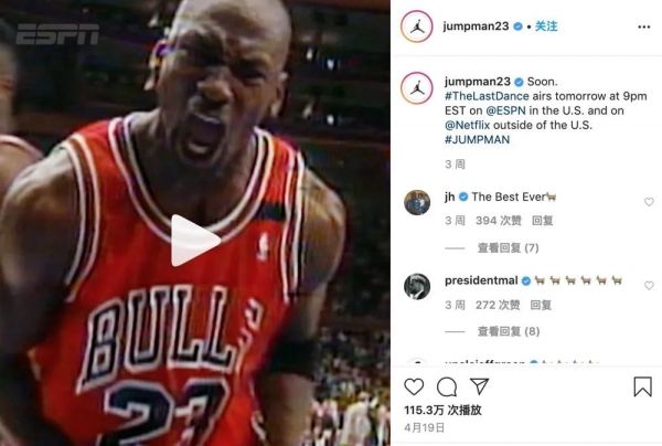 ●Jordan在其品牌的Instagram發(fā)布《最后之舞》的片段 | 圖片來源:Instagram@jumpman23