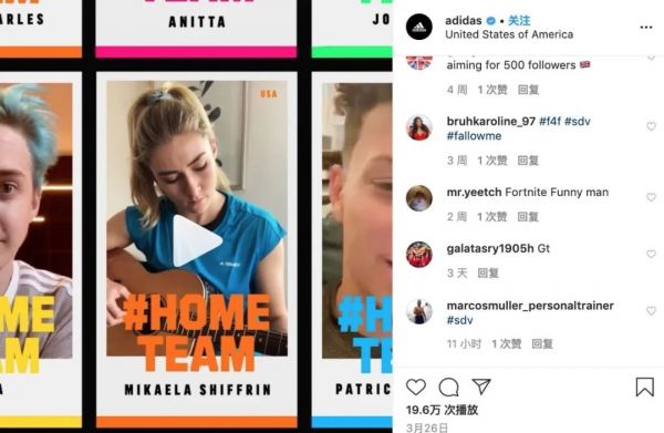 在歐洲和美國開始停擺后不久,耐克公司就發(fā)布了一些視頻,展示了普通人以及像Lebron James這樣的明星在家里鍛煉的場景。足球冠軍“C羅”Cristiano Ronaldo(也是Instagram上粉絲最多的人之一)向粉絲發(fā)起了耐克贊助的腹肌訓(xùn)練挑戰(zhàn)。阿迪達(dá)斯推遲了原計劃中的新產(chǎn)品推廣活動,改為發(fā)布HomeTeam應(yīng)用,通過這個應(yīng)用可以參與家庭健身活動、課程以及接收來自像奧林匹克滑雪運動員Mikaela Shiffrin這樣運動員的加油鼓勁。