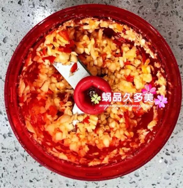 2、在特百惠小旋風切剁器中放入辣椒和大蒜,輕拉旋風,將其拉碎;