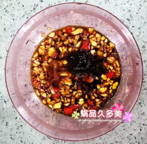 3、取特百惠艾力格晶瑩餐碗一只,在里面倒入辣椒蒜末,然后加入2勺醋、2勺生抽、1勺耗油、1勺糖調成料汁;