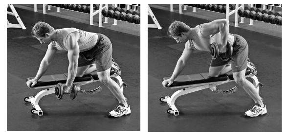 左手持啞鈴,右手和右膝擱在平放的訓(xùn)練椅上。保持背部平直,上身與地面平行。讓左臂從肩膀垂下,手掌朝著軀干。抬起左上臂,直至其略高于平行于地面的位置,肘部高于軀干位置。停留片刻后放下左臂,再重復(fù)動(dòng)作。在做該練習(xí)時(shí),肘部始終靠近身體,手掌保持中性姿勢(即朝著軀干),這樣會(huì)更多地鍛煉到背闊肌。如若翻轉(zhuǎn)手掌使其對著腳,肘部朝外(遠(yuǎn)離身體)劃船,則會(huì)令肩胛骨上的縮肌得到更大程度的鍛煉。