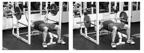 平躺在訓(xùn)練椅上,雙臂打開略寬于肩、手握杠桿,背部自然拱起,雙腳平放在地上。將杠鈴從支架上取下來,舉到胸部上方。將杠鈴放低到胸部中線位置,停留片刻后舉起,回到起始姿勢。