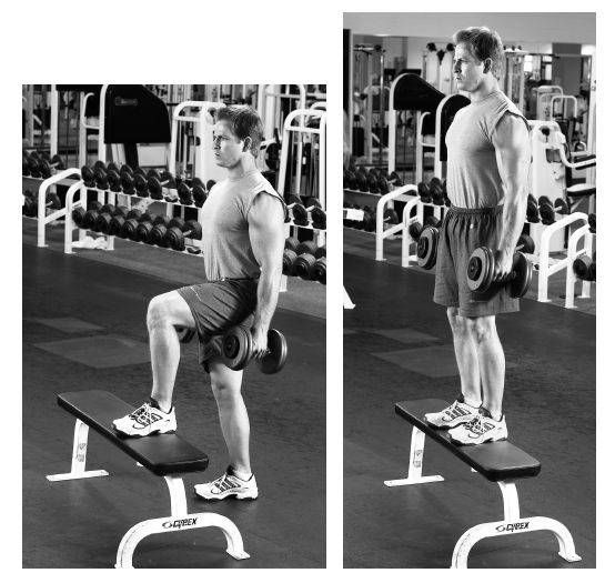 手持一對啞鈴,站在一張標(biāo)準(zhǔn)的平躺訓(xùn)練椅前。抬起一只腳,穩(wěn)穩(wěn)地踩在訓(xùn)練椅上,用腳后跟蹬椅,使另一只腳踏上椅子。后踏上椅子的腳先下地,然后另一只腳也下來,如此重復(fù)多次,直到做完所要求的練習(xí)次數(shù)。
