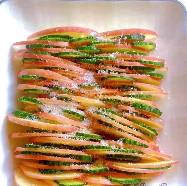 簡(jiǎn)單回顧一下這個(gè)神仙吃法:新鮮帶刺的黃瓜,嘎啦脆甜的蘋果,切片,撒糖,拌勻,齊活!