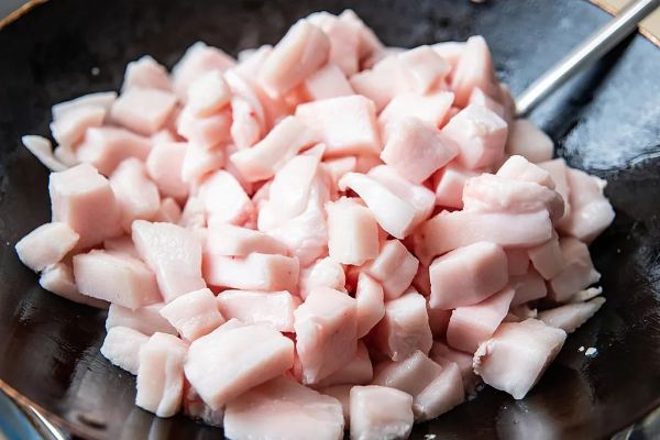 【豬油的正確熬制方法】鍋中加入小半碗清水,再放入切小塊的豬油,大火將水燒開后立馬轉(zhuǎn)小火,待豬油塊體積變小,顏色從白色變成微黃色即可。