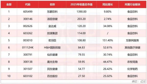 在消費(fèi)升級、科學(xué)營養(yǎng)理念深入人心以及政策持續(xù)支持的共同推動下,行業(yè)整體穩(wěn)步向上。頭部企業(yè)不僅營收增長穩(wěn)健,資本市場也用“真金白銀”投出了信心——2025年,主要上市企業(yè)的總市值普遍上漲。