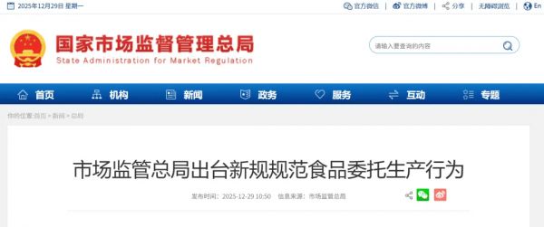 12月29日,國家市場監(jiān)督管理總局發(fā)布《食品委托生產(chǎn)監(jiān)督管理辦法》。