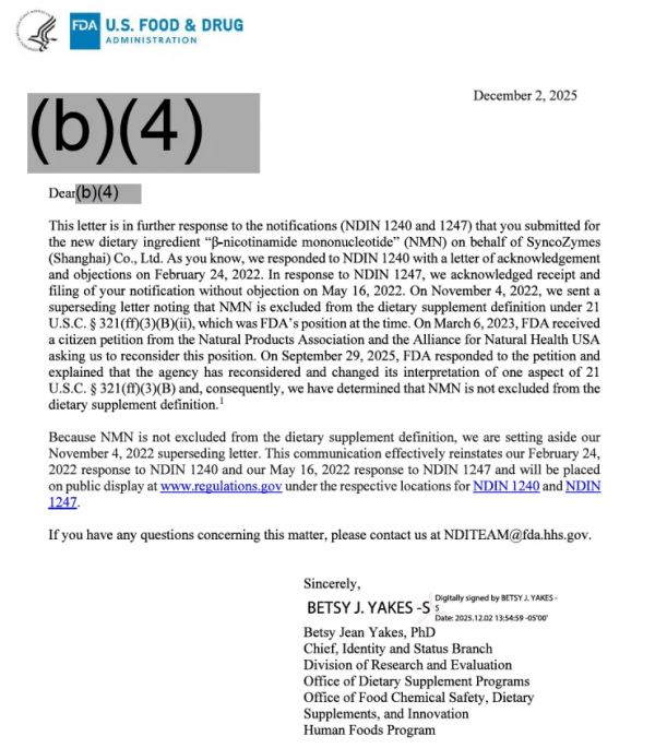 12月9日 ,美國FDA食品與營養(yǎng)辦公室就 NDI 1240(β-煙酰胺單核苷酸)向尚科生物醫(yī)藥(上海)有限公司出具的恢復(fù)認(rèn)定回復(fù)函。根據(jù)回復(fù)函, 美國FDA在2025年9月29日已得出NMN未被排除在膳食補(bǔ)充劑定義范疇外的結(jié)論,隨后, 澳大利亞醫(yī)療用品管理局更新并將煙酰胺單核苷酸(NMN)正式納入《Therapeutic Goods (Permissible Ingredients) Determination (No. 4) 2025》(允許在補(bǔ)充藥物中使用的成分清單)。