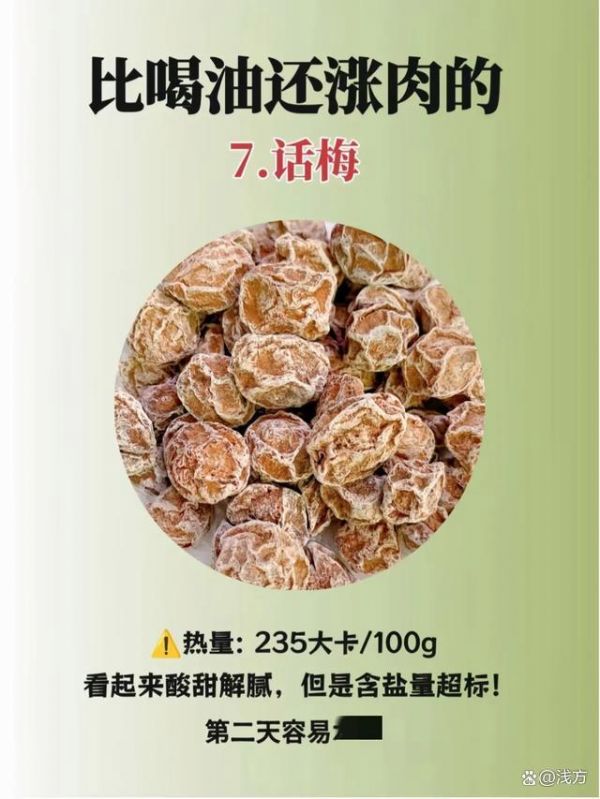 話梅看起來酸甜解膩,但每100克的熱量高達(dá)235大卡,而且含鹽量超標(biāo),容易導(dǎo)致水腫。很多人覺得話梅是低熱量零食,結(jié)果反而攝入了過多鹽分和熱量。我的建議是,減脂期盡量少吃話梅,如果真的想吃,可以選擇低鹽版本。