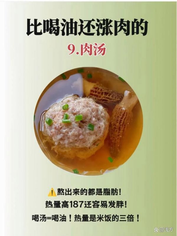 肉湯雖然看起來很清淡,但熬出來的都是脂肪,每100克的熱量高達(dá)187大卡,相當(dāng)于米飯的三倍。很多人覺得喝湯很健康,結(jié)果反而攝入了過多脂肪。我的建議是,減脂期盡量少喝肉湯,如果真的想喝,可以去掉表面的浮油。