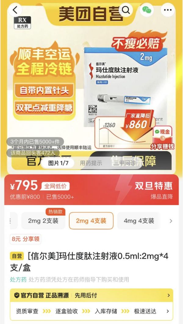 “新銳選手”瑪仕度肽亦同步加入降價陣營。據(jù)美團平臺最新價格顯示,該產(chǎn)品2mg四支裝、4mg四支裝、6mg兩支裝的售價分別低至795元、1445元、1005元。對比其去年6月上市之初的同規(guī)格定價1260元、2142元、2920元-3200 元,上述三款規(guī)格的價格降幅已分別超過36%、32%、60%。