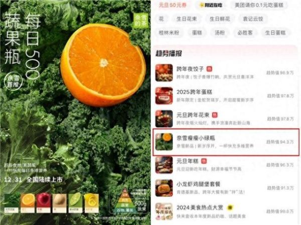 “抓緊洗菜”、“忙著切菜”是奈雪門店員工迎接2025年的工作狀態(tài),與之呼應(yīng)的則是大批年輕人紛紛涌入奈雪“吃草”。2024年12月31日,奈雪重磅推出新品蔬果茶「瘦瘦小綠瓶」及華南限定款「補(bǔ)水小粉瓶」,借鑒彩虹飲食法及中國營養(yǎng)學(xué)會(huì)《中國居民平衡膳食寶塔》“人體每日需補(bǔ)充至少500g蔬果”的建議,將羽衣甘藍(lán)、蓮霧等超級食材加入產(chǎn)品,奈雪在奶茶和果茶之外,開辟了全新蔬果茶的產(chǎn)品結(jié)構(gòu),上新當(dāng)日「瘦瘦小綠瓶」躥升美團(tuán)外賣趨勢榜第4名,掀起嘗鮮熱浪。