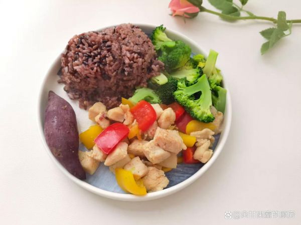 做法:將雞胸肉焯水后入鍋煎炒,再加入甜椒、調(diào)料,炒一炒即可,其他配菜隨意搭配,比如玉米、胡蘿卜丁等;再用開水煮西蘭花,搭配一根紫薯,膳食纖維豐富又管飽。