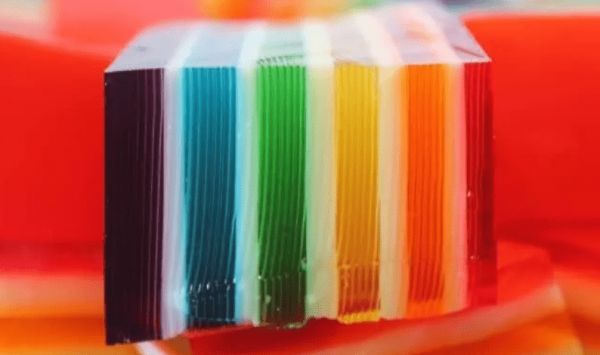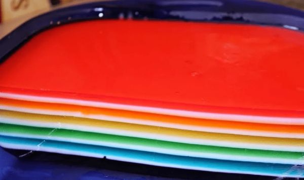 重復(fù)以上2個(gè)步驟,一層顏色,一層白色。從藍(lán)色開始建果凍層,然后是綠色、黃色、橙色和紅色,這樣才是彩虹的正確色彩順序,也符合審美習(xí)慣。