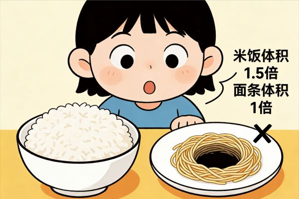 饅頭、面條等面食體積相對較小,容易在不知不覺中攝入過量。相比之下,一碗米飯的視覺分量更直觀。
