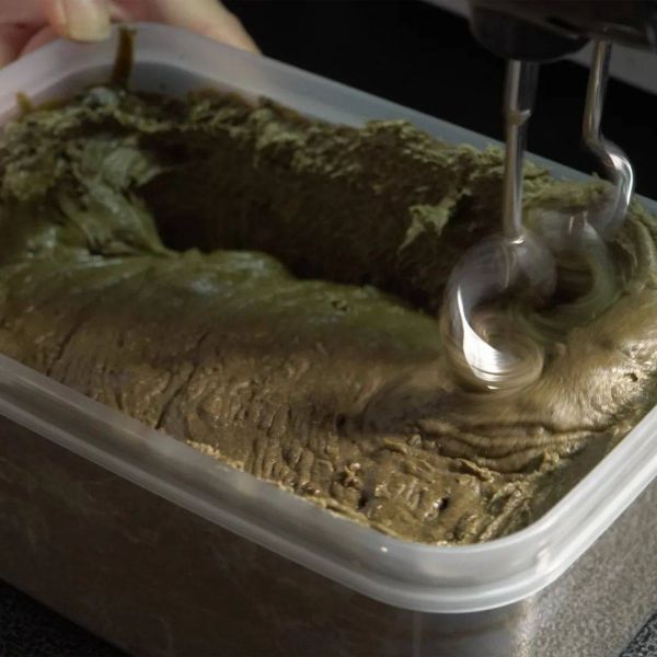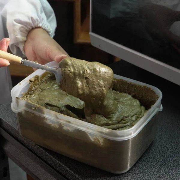 將已加熱的熱灸膏取出,先用鏟子將固體攪拌均勻,完成后,將開到最小檔的攪拌器置于熱灸膏底部,以防膏體飛濺,攪拌至粘稠狀即可。